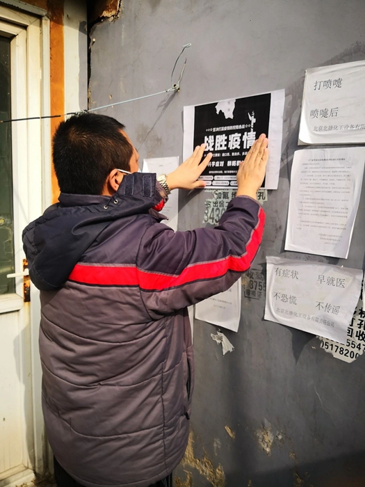 為了將社區防控真正落實落細,化實廠黨總支經過研究,迅速成立以總務部為核心的疫情防控小分隊。準確掌握住戶的信息是防控的關鍵,化實廠總務部3位同志放棄休息,全員到崗,與街道、社區的工作人員一起入戶,逐戶排查、登記、宣傳防控要點、在院內張貼宣傳材料,確保宣傳到戶、宣傳到人。