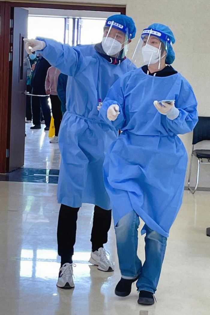 我所下沉的社區居民將近2600人,一般情況下排隊20到30米,人多的時候隊伍能有100多米長。社區分為兩道核酸通道,一天一條通道能掃描1200至1300人左右。由于戴著防護面罩與口罩,說話聲音并不是很清晰,為此我只能不停地重復著相同的提示,一天下來不僅嗓子沙啞了,汗水也浸透了全身。
