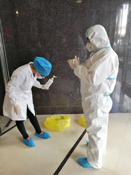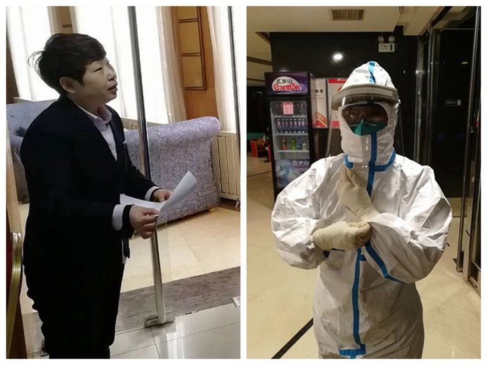 “我是黨員,我先來”,時間緊任務急,作為一名黨員率先垂范,周麗麗勇敢地接下送餐和垃圾收納任務。為確保完成一日三次的送餐和垃圾收納工作,周麗麗每次都要全副武裝穿上防護服,并嚴格按照要求進行消殺。俗話說隔行如隔山,從未接觸過防護服,其穿脫過程異常艱難,但周麗麗不怕麻煩。為了防止交叉感染,隔離區域的電梯停止使用,每次賓館人員送餐都要爬樓梯將餐飲搬到樓梯間,然后由全副武裝的周麗麗徒步一個房間一個房間地配送。送餐完畢,還要一個房間一個房間地收納垃圾。由于防護服不透氣,剛一行動起來,周麗麗已經渾身是汗,但是她沒有退縮,每次都保質保量按時完成了任務。在數日的時間里多次進入隔離區,圓滿地完成了任務,真正做到了關鍵時刻站得出來,危急時刻豁得出來。